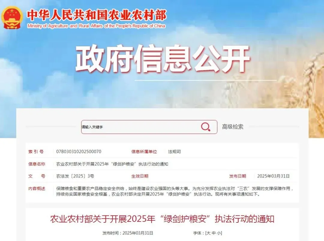 为充分发挥农业执法对“三农”中心工作的服务保障作用,夯实国家粮食安全根基,近日,农业农村部印发《农业农村部关于开展2025年“绿剑护粮安”执法行动的通知》(以下简称《通知》),部署开展“绿剑护粮安”执法行动。 《通知》强调,各地要聚焦农资质量、农产品质量安全、动植物检疫、畜禽屠宰等重点领域,严厉打击制售假劣农资、种子套牌侵权、违法使用禁限用药物等坑农害农、危害粮食安全和农产品质量安全违法行为,保障粮食和重要农产品稳定安全供给,维护农民群众合法权益,守护人民群众“舌尖上的安全”。 《通知》要求,各地要结合实际细化任务、压实责任,加强部门间、区域间执法协作,完善信息共享、线索通报、联动响应等机制,实现“一处发现、多地联查、溯源查处”。要坚持“执法为民、服务三农”的理念,深入落实行政裁量权基准制度,严格规范农业领域涉企行政检查,持续优化执法方式,让农业执法既有力度又有温度。 下一步,农业农村部将针对重点领域违法案件查办、疑难案件法律适用等情况加强对地方指导,对涉及区域广、社会关注度高、案情疑难复杂的案件挂牌督办,确保行动落地见效。