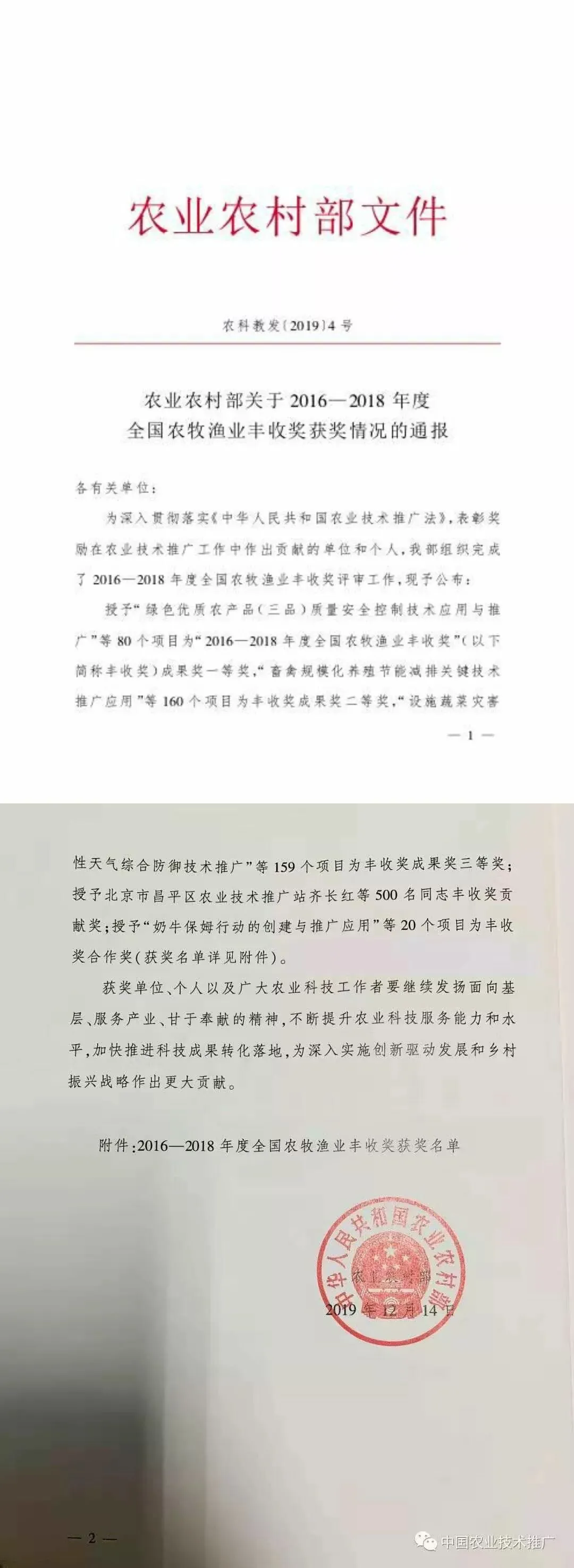 “全国农牧渔业丰收奖”,是经国务院批准设立的省部级奖项,开始于1987年,每三年开展一次,主要用于奖励在农业技术推广活动中做出突出贡献的集体和个人。丰收奖奖项分成果奖、贡献奖和合作奖三类,其中成果奖分一等(本届80项)、二等(本届160项)、三等奖(本届159项),贡献奖(本届500名)和合作奖(本届20项),贡献奖和合作奖不分奖励等级均按丰收奖一等奖对待。丰收奖评审也是农业科技推广工作的重要奖励渠道和工作抓手,受到业界广泛重视。