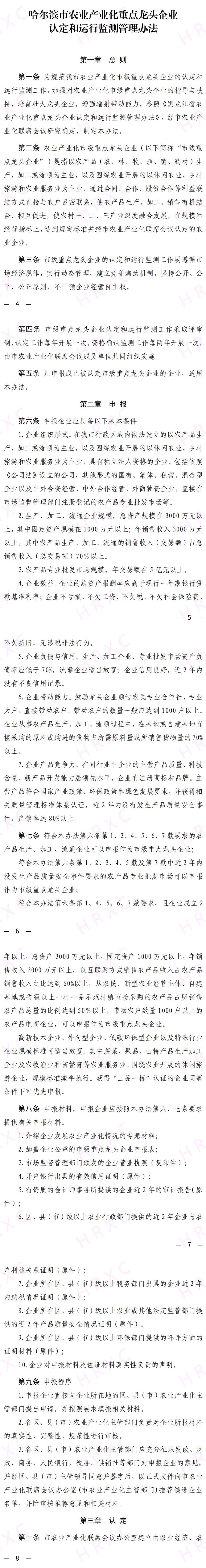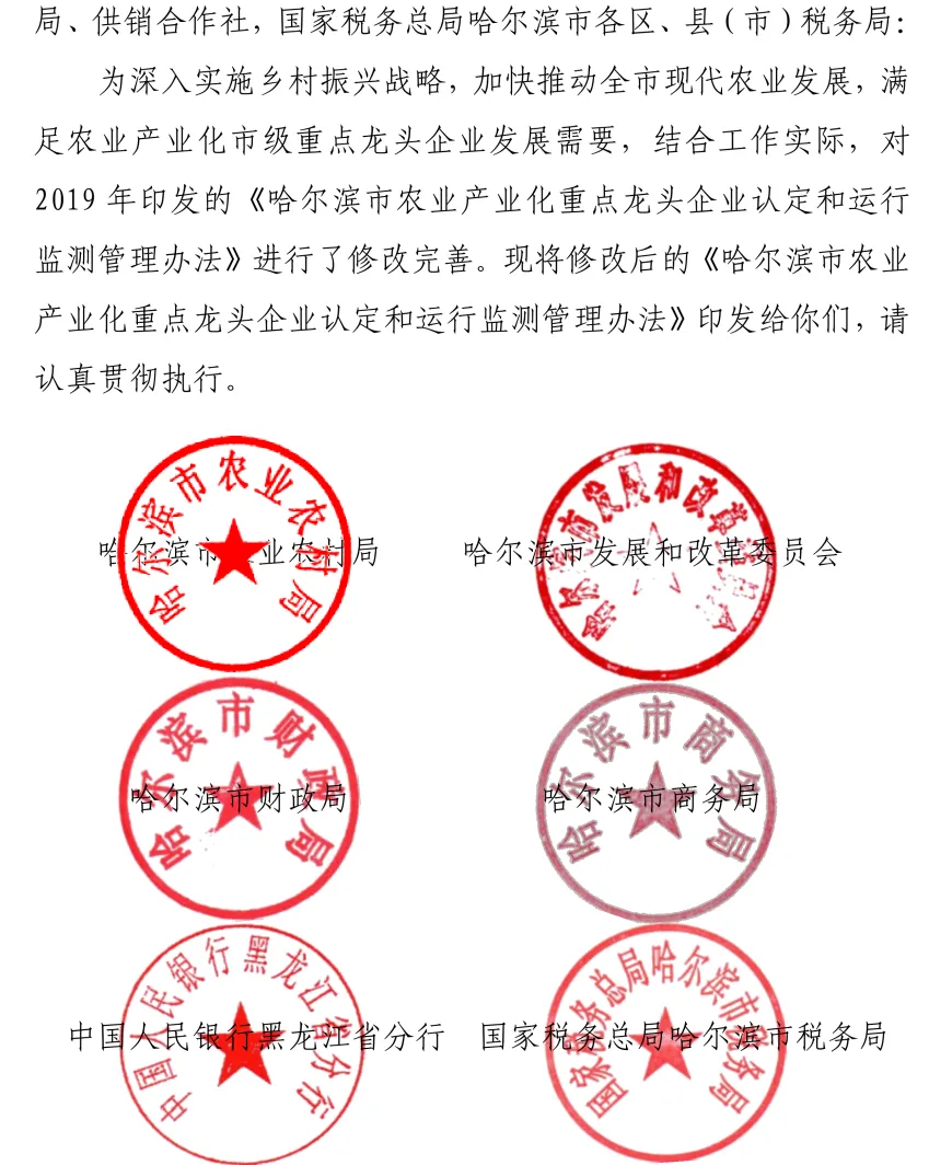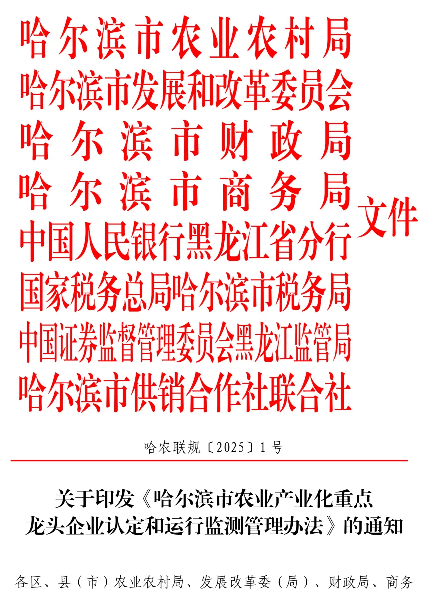 关于印发《哈尔滨市农业产业化重点龙头企业认定和运行监测管理办法》的通知