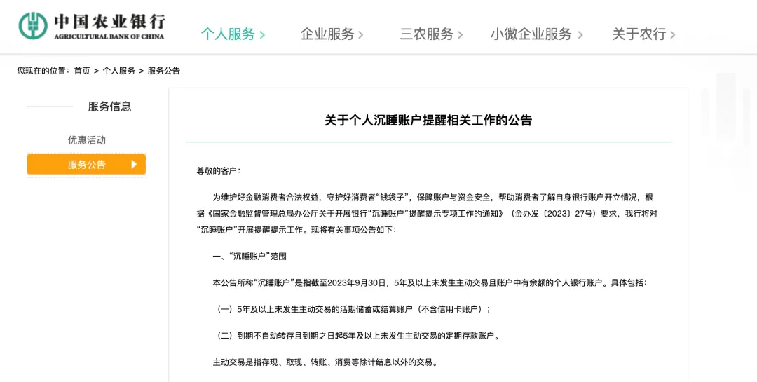近日,工商银行、农业银行接连发布公告,表示会根据国家金融监督管理总局办公厅《关于开展银行“沉睡账户”提醒提示专项工作的通知》,对“沉睡账户”开展提醒提示工作。两家大行在公告中表示,此举旨在维护好金融消费者合法权益,守护好消费者“钱袋子”,保障账户与资金安全,帮助消费者了解自身银行账户开立情况。根据公告, 工商银行、农业银行的“沉睡账户”认定范围是指截至2023年9月30日,5年及以上未发生主动交易且账户中有余额的个人银行账户。具体包括5年及以上未发生主动交易的活期储蓄或结算账户(不含信用卡账户)、到期不自动转存且到期之日起5年及以上未发生主动交易的定期存款账户。其中,主动交易是指存现、取现、转账、消费等除计结息、账户管理费以外的交易。