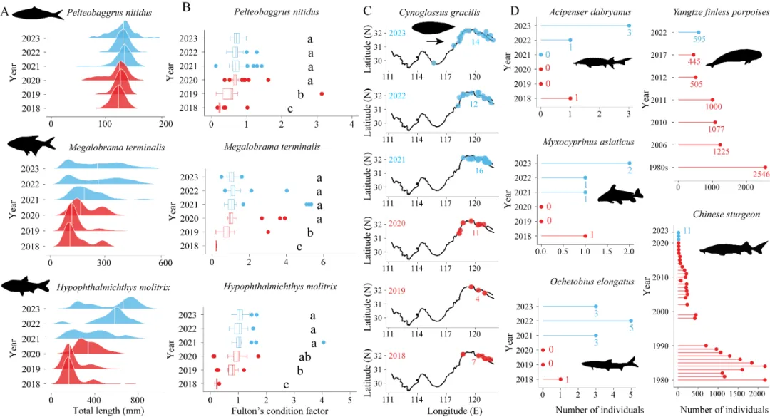 全面禁渔前后长江鱼类生物量、丰度和生物多样性指数变化长江鱼类全长(A)、肥满度(B)、鱼类栖息活动范围(C)及濒危物种丰度(D)的年际变化