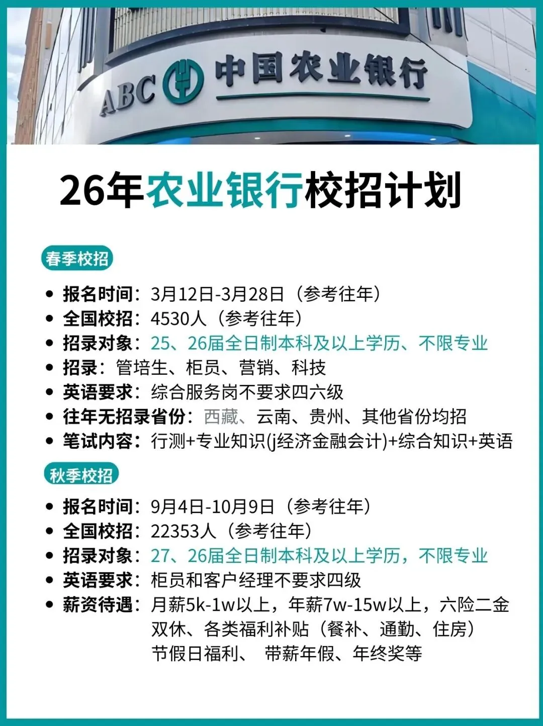 作为国内六大国有商业银行之一,农业银行凭借广泛的网点覆盖、稳健的经营发展以及完善的人才培育体系,始终是应届毕业生求职的优选目标。2026年秋季校园招聘即将拉开帷幕,本次秋招在岗位供给、薪酬福利与职业成长空间等方面,均为毕业生搭建了优质的发展平台。这份涵盖全流程的应聘攻略,助你精准把握机会,顺利通关!