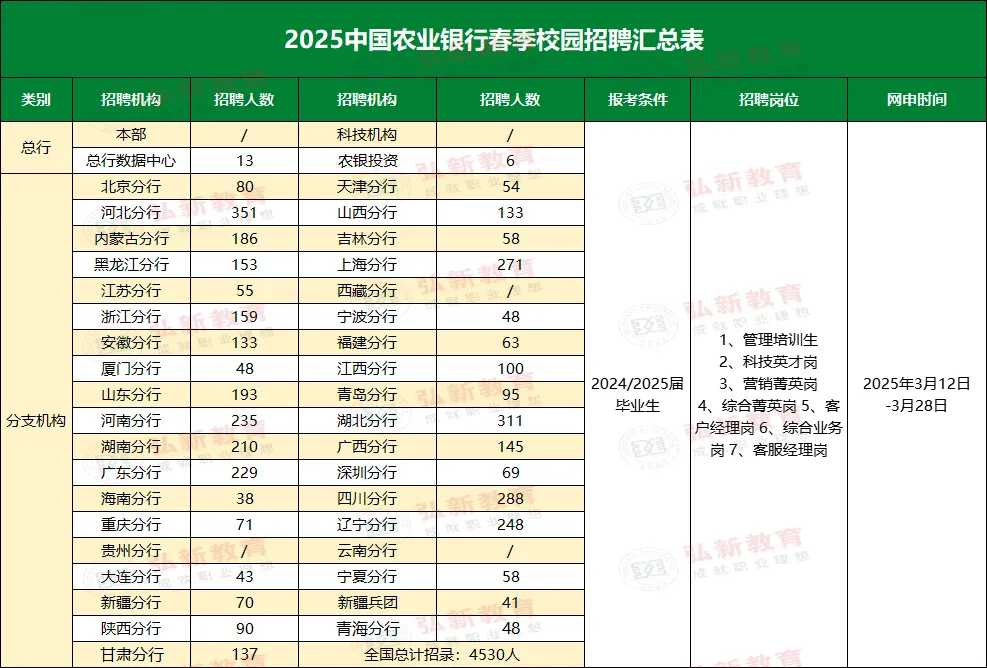 届别要求:面向2027届、2026届。2025届应届毕业生,学历要求本科及以上,; 英语要求:多数岗位不强制要求英语四六级证书,仅少数总行直属机构、国际业务相关岗位需提供四六级证明; 志愿填报:可选择报考总行直属机构、境内一级分行、子公司三类岗位,每类岗位最多可填报2家机构,志愿采用平行志愿模式,建议优先填报目标地区岗位。
