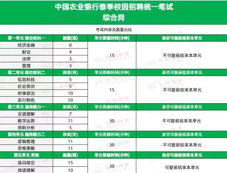 综合知识:占比约15%,包含农业银行特色常识(如行史、企业文化、最新发展战略)、经济学、金融学、会计学、计算机基础等内容。其中,经济学考点偏冷门但近年难度有所降低,金融学考点覆盖面广但难度较低,建议优先复习农业银行特色常识与金融学基础知识点。