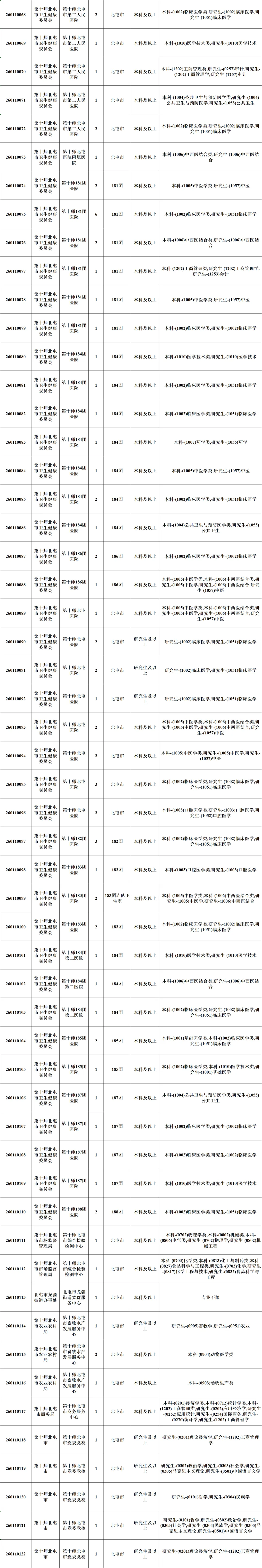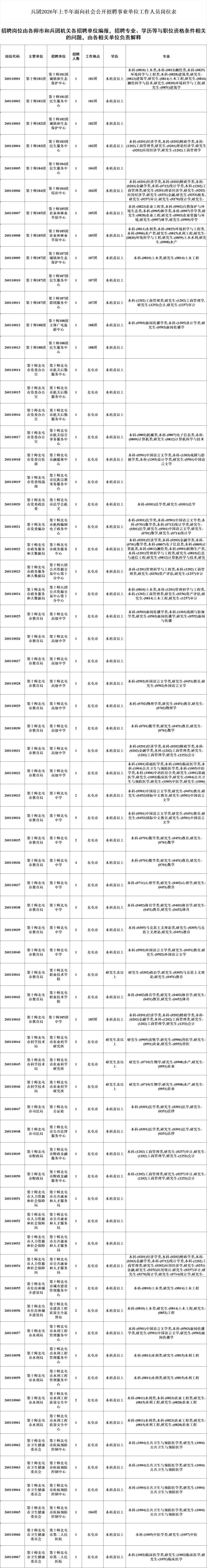 新疆生产建设兵团2026年上半年面向社会公开招聘事业单位工作人员公告根据《事业单位人事管理条例》(国务院令第652号)《关于进一步做好兵团事业单位公开招聘工作的通知》(兵人社发〔2024〕64号)等有关规定,新疆生产建设兵团(以下简称兵团)人力资源和社会保障局将组织实施2026年上半年面向社会公开招聘事业单位工作人员工作,本次公开招聘共计1520个岗位2183人。现将有关事项公告如下: