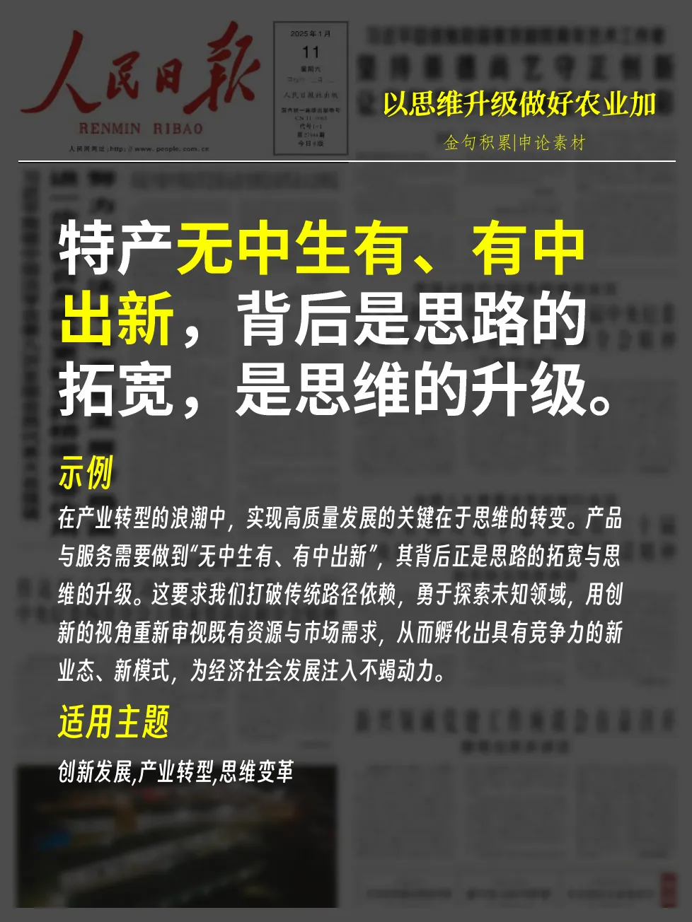 - 示例:在产业转型的浪潮中,实现高质量发展的关键在于思维的转变。产品与服务需要做到“无中生有、有中出新”,其背后正是思路的拓宽与思维的升级。这要求我们打破传统路径依赖,勇于探索未知领域,用创新的视角重新审视既有资源与市场需求,从而孵化出具有竞争力的新业态、新模式,为经济社会发展注入不竭动力。