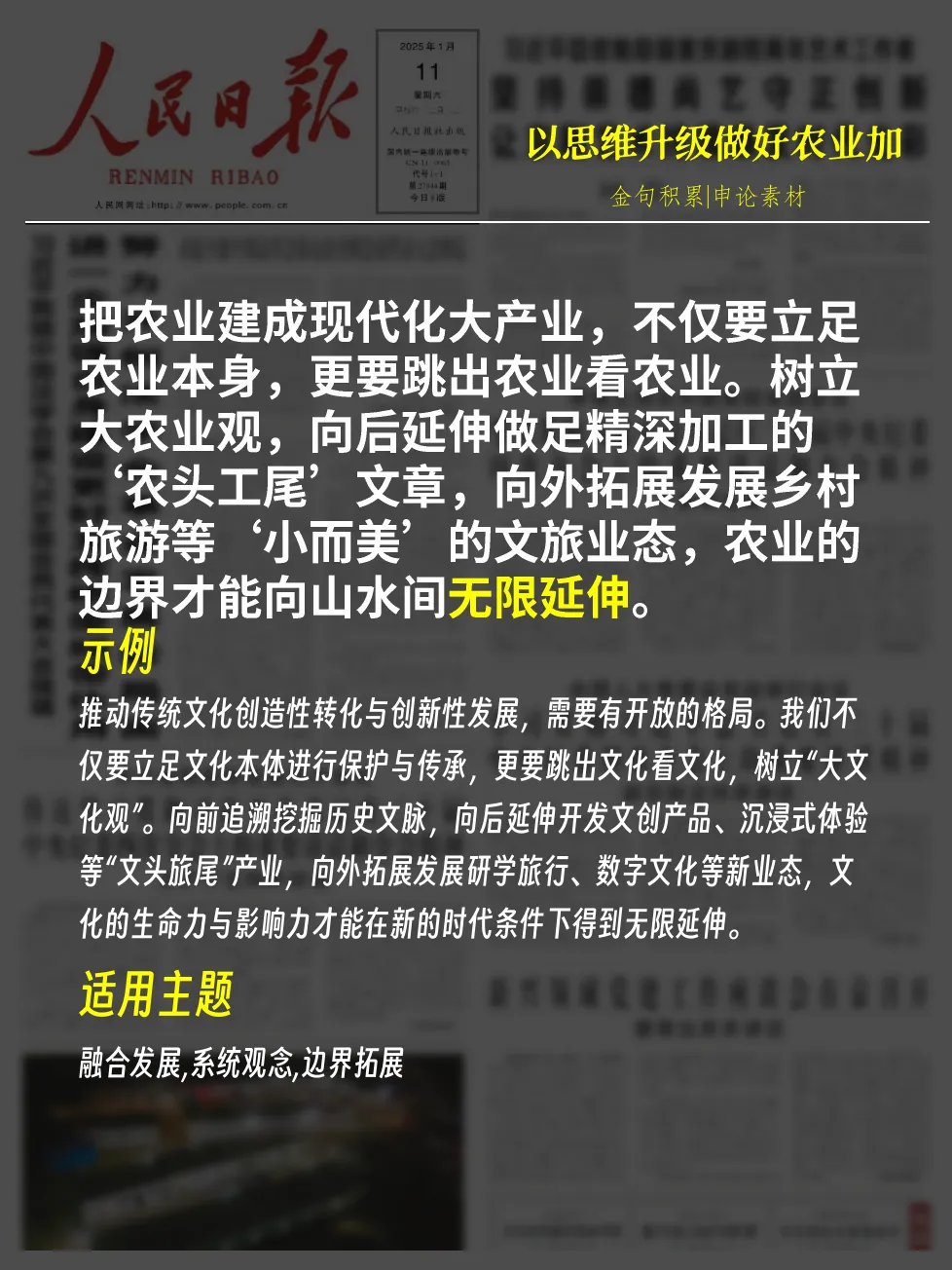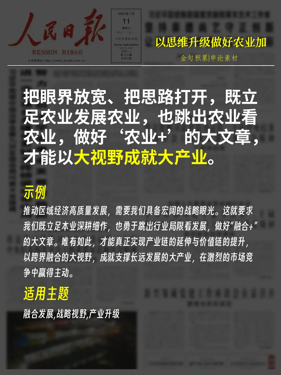 - 示例:推动区域经济高质量发展,需要我们具备宏阔的战略眼光。这就要求我们既立足本业深耕细作,也勇于跳出行业局限看发展,做好“融合+”的大文章。唯有如此,才能真正实现产业链的延伸与价值链的提升,以跨界融合的大视野,成就支撑长远发展的大产业,在激烈的市场竞争中赢得主动。