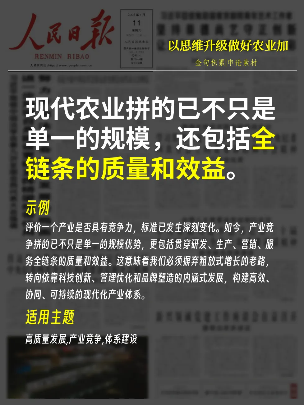 - 示例:评价一个产业是否具有竞争力,标准已发生深刻变化。如今,产业竞争拼的已不只是单一的规模优势,更包括贯穿研发、生产、营销、服务全链条的质量和效益。这意味着我们必须摒弃粗放式增长的老路,转向依靠科技创新、管理优化和品牌塑造的内涵式发展,构建高效、协同、可持续的现代化产业体系。