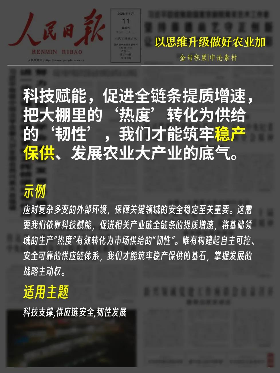 - 示例:应对复杂多变的外部环境,保障关键领域的安全稳定至关重要。这需要我们依靠科技赋能,促进相关产业链全链条的提质增速,将基础领域的生产“热度”有效转化为市场供给的“韧性”。唯有构建起自主可控、安全可靠的供应链体系,我们才能筑牢稳产保供的基石,掌握发展的战略主动权。