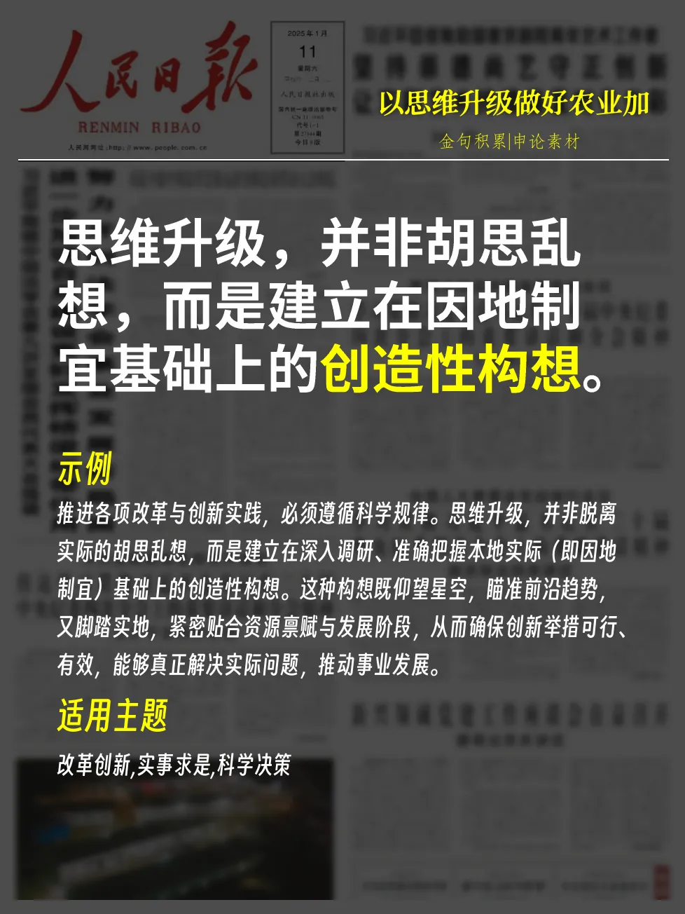 - 示例:推进各项改革与创新实践,必须遵循科学规律。思维升级,并非脱离实际的胡思乱想,而是建立在深入调研、准确把握本地实际(即因地制宜)基础上的创造性构想。这种构想既仰望星空,瞄准前沿趋势,又脚踏实地,紧密贴合资源禀赋与发展阶段,从而确保创新举措可行、有效,能够真正解决实际问题,推动事业发展。