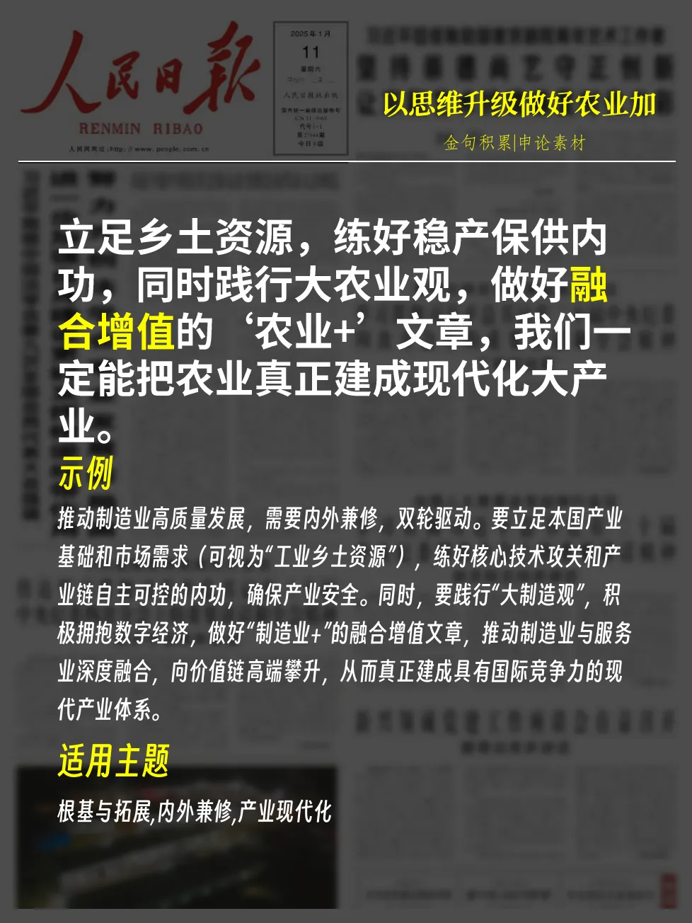 - 示例:推动制造业高质量发展,需要内外兼修,双轮驱动。要立足本国产业基础和市场需求(可视为“工业乡土资源”),练好核心技术攻关和产业链自主可控的内功,确保产业安全。同时,要践行“大制造观”,积极拥抱数字经济,做好“制造业+”的融合增值文章,推动制造业与服务业深度融合,向价值链高端攀升,从而真正建成具有国际竞争力的现代产业体系。