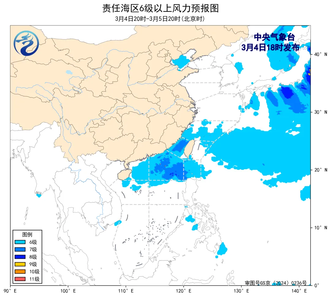 4日20时至5日20时,台湾海峡、南海东北部海域将有5~7级、阵风8级的偏北到东北风,东海南部海域将有5~6级、阵风7级的偏东到东南风,渤海、巴士海峡、南海西北部海域将有4~6级、阵风7级的偏东到东北风。