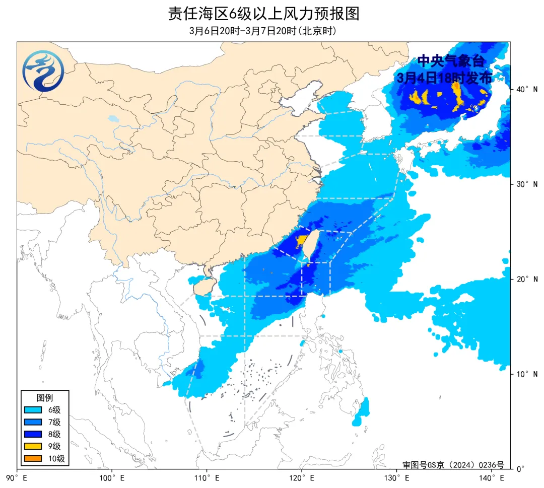 预计,3月7日夜间至3月11日白天,东海大部海域、南海大部海域将有6~8级、阵风9级的大风,台湾海峡、巴士海峡将有7~9级、阵风10级的大风,台湾以东洋面将有8~9级、阵风10级减弱至6~7级、阵风8级的风,北部湾将有6~7级、阵风8级的风,琼州海峡将有5~6级、阵风7级的风。