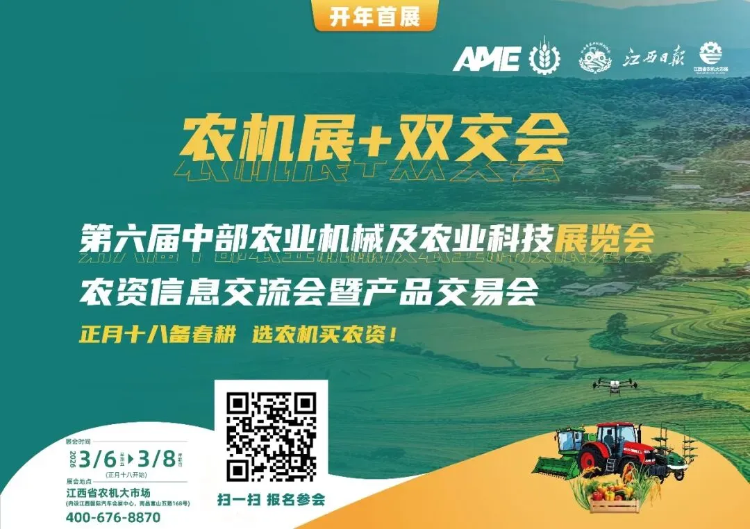 春耕备耕,农机先行。备受行业瞩目的第六届中部农业机械及农业科技展览会将于2026年3月6日至8日在江西省农机大市场(内设江西国际汽车会展中心)盛大启幕。本届展会采用“农机展+双交会”模式,同期举办农资信息交流会暨产品交易会。展品覆盖农业机械、园林机械、粮油设备、植保种子、现代农业配套、农资农药、种苗花卉、农业科技、农业金融、农产特产等全产业链环节,全力打造中部乃至全国丘陵山区农业机械化推广、应用与行业交流的 “第一平台”!