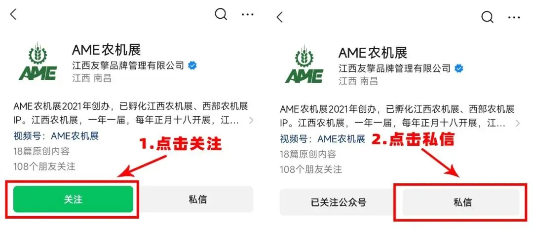 1、扫描以下二维码,关注微信公众号“AME农机展”。