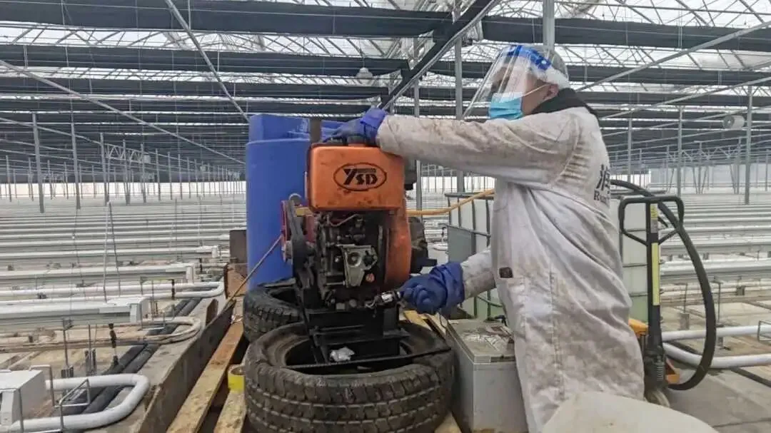 作业现场,工作人员严格遵循农业规范,采用次氯酸钠 1:26 稀释液、Menno 1:100 稀释液,对温室进行全面消杀处理,重点消杀区域包括:地面、种植槽、幕布、侧保温设施及暖通管道,开展全方位无死角喷施,精准切断病虫害传播途径,为番茄苗定植筑牢安全防线。技术负责人王泰表示,定植前消杀是保障番茄长势、品质与产量的关键,是全年丰产丰收的基础。