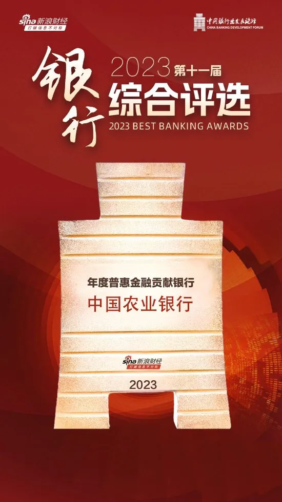 1月19日,由新浪财经主办的“2023(第十一届)银行综合评选”结果正式揭晓,中国农业银行获评“年度最佳国有商业银行”“年度普惠金融贡献银行”两个奖项。