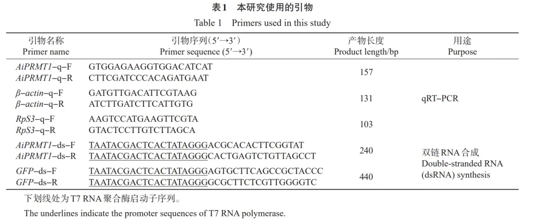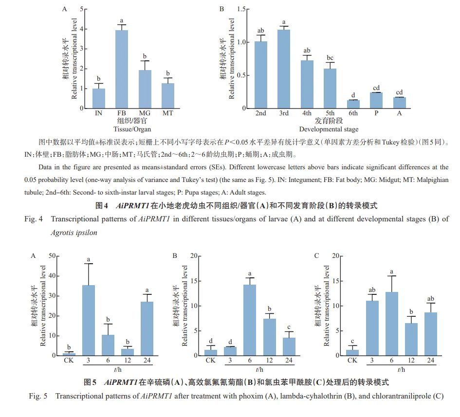 本研究以重要农业害虫小地老虎(Agrotis ipsilon)为对象,鉴定出1个PRMT基因(命名为AiPRMT1),分析了AiPRMT1的分子特征及其在3种不同类型杀虫剂(辛硫磷、高效氯氟氰菊酯和氯虫苯甲酰胺)胁迫下的转录模式,并利用RNA干扰(RNA interference, RNAi)技术沉默AiPRMT1,探究小地老虎幼虫对3种杀虫剂的耐受性,旨在阐明AiPRMT1在昆虫应对杀虫剂胁迫中的功能,并为开发以AiPRMT1为靶标的小地老虎新型防治技术提供理论依据。