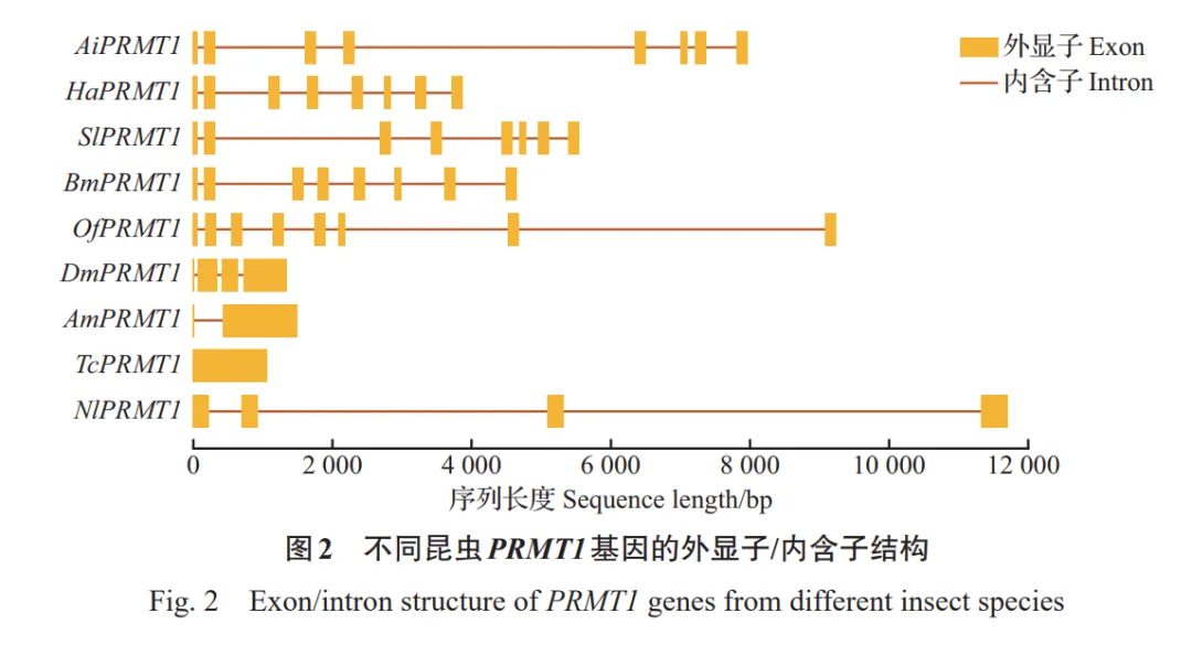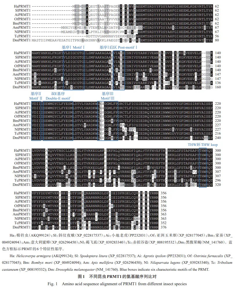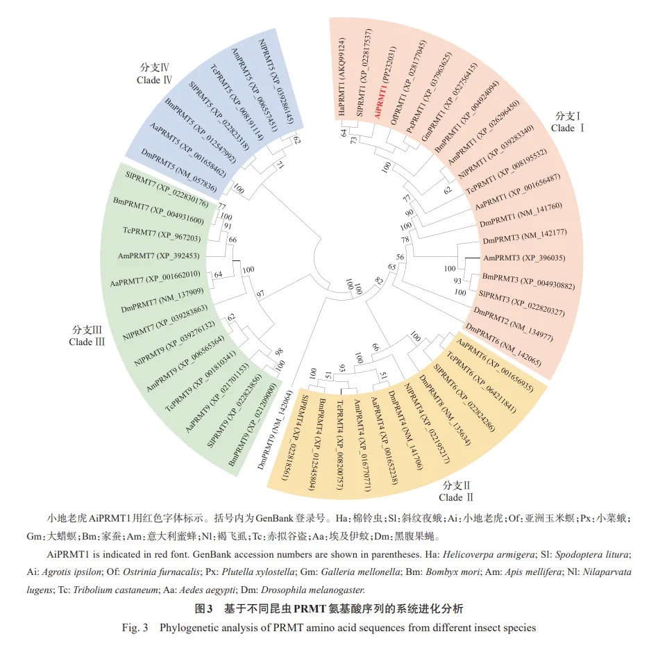 PRMT及其介导的精氨酸甲基化修饰在昆虫生长发育、生殖和昼夜节律等重要生理过程中的作用已在黑腹果蝇、埃及伊蚊、家蚕及棉铃虫等多种昆虫中得到证实。然而,昆虫PRMT是否在杀虫剂耐受性中发挥作用,至今仍不明确。本研究以重要农业害虫小地老虎为对象,探究了AiPRMT1在杀虫剂耐受性中的功能。通过同源检索获得了AiPRMT1基因序列,发现其编码的AiPRMT1蛋白具有6个特征性基序,符合PRMT的典型特征,这些基序对其催化功能极为重要。AiPRMT1基因由8个外显子组成,且与棉铃虫、斜纹夜蛾、家蚕、亚洲玉米螟等鳞翅目昆虫的PRMT1同源基因具有相同的外显子数量和长度,表明鳞翅目昆虫的PRMT1可能来源于共同的祖先基因。