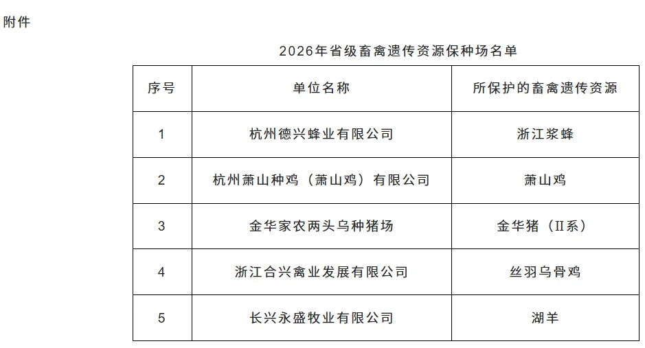 根据《畜禽遗传资源保种场保护区和基因库管理办法》《浙江省种畜禽管理办法》等规定,经企业申报、当地农业农村主管部门审核推荐,我厅组织专家现场评估,现确定杭州德兴蜂业有限公司等5家单位为2026年省级畜禽遗传资源保种场。有效期为自公告之日起5年。