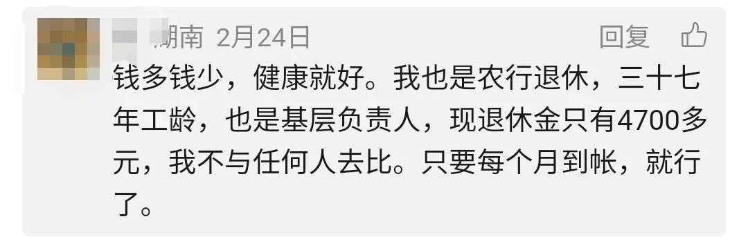 农行退休,三十七年工龄,也是基层负责人,现退休金只有4700多元,我不与任何人去比。只要每个月到账,就行了。