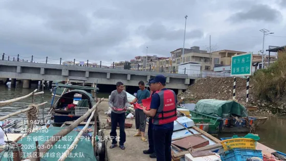 该宣传活动以悬挂横幅、“登船入户、码头宣讲、精准普法” 为核心,执法人员深入漠阳江水域的渔船停泊点、码头及渔民聚居区,通过 “面对面” 宣讲、“点对点” 送达的方式,向广大渔民群众和渔业经营户开展禁渔政策宣传。通过悬挂横幅、执法人员逐船登检,向船主及船员派发《禁渔期管理告知书》,明确禁渔时间、禁渔范围、作业限制及相关法律责任,确保政策要求传达到每一艘渔船、每一位渔民。结合《中华人民共和国渔业法》《广东省渔业管理条例》等法律法规,执法人员重点解读禁渔期内非法捕捞、使用禁用渔具、收购非法渔获物等行为的法律后果,引导渔民自觉遵守禁渔规定,增强守法意识。针对渔民关心的休渔补贴、转产转业、安全管理等问题,执法人员现场进行耐心解答,消除渔民疑虑,争取群众对禁渔工作的理解与支持。