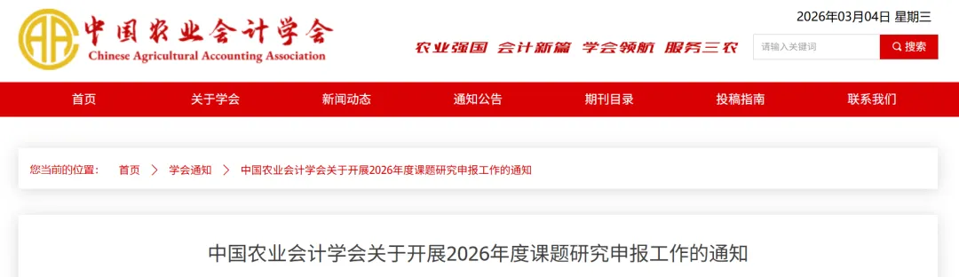 为深入贯彻党的二十大和二十届四中全会精神,认真落实中央农村工作会议、全国会计管理工作会议部署,更好发挥农业系统财务会计在推进乡村全面振兴、加快建设农业强国中的作用,更好服务农业农村高质量发展,中国农业会计学会现组织开展2026年度课题研究申报工作,有关事项通知如下: