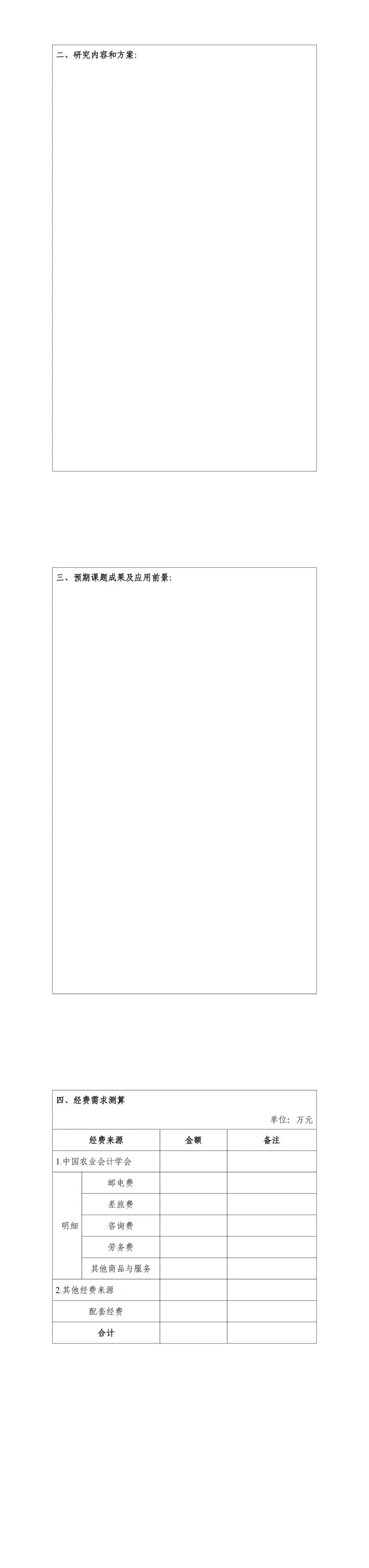(二)请按要求填写课题研究申请书(见附件1)。申报材料由申报人所在单位加盖公章确认,一式两份快递至中国农业会计学会(北京市朝阳区麦子店街20号楼,邮编100125),信封上请注明“申报课题”字样,同时,将申报书电子版与盖章扫描版发送到邮箱:zgnykjxh1983@163.com。