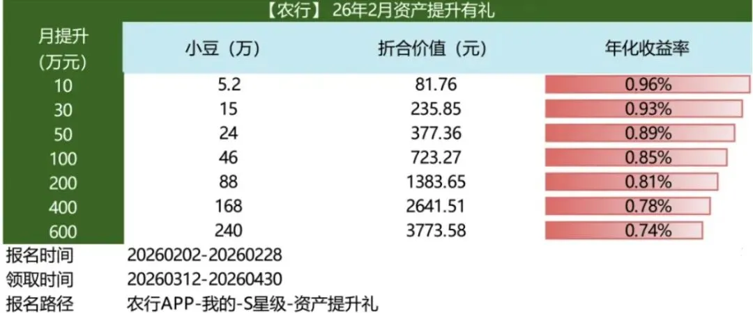 农行的活动设计更为长期,根据资产提升金额分为七个档位,最低10万起即可参与,奖励以“小豆”形式发放。以兑换京东E卡计算,636小豆≈1元,1万小豆等价于约15.7元。资产提升越高,获得的小豆数量越多,例如提升600万元以上可获得240万小豆。