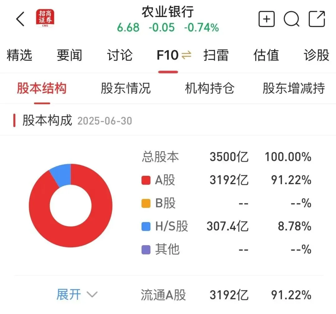 农业银行A股股本3192亿,收盘价6.68元,A股市值21322亿元。