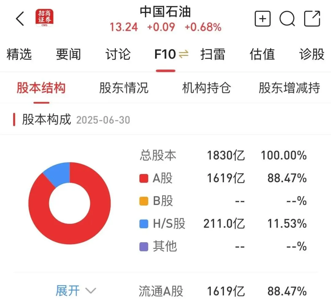 小米椒在这里解释下,因为这几个龙头都是A+H上市的,所以看到的总股本是包含H股的。如果只看A股股本,乘以A股股价,目前确实是中国石油市值第一,有图有真相。