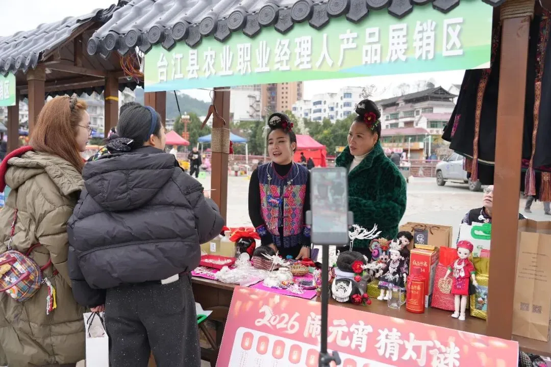 赏非遗、购农产的同时,猜灯谜、投壶、趣味投篮、乒乓球投掷等丰富多彩的互动活动,让现场更添欢声笑语。线上直播间里同样热度不减,专业主持人结合讲解词倾情推介,镜头扫过热闹的展销现场,将台江农特产品通过屏幕销往全国各地,真正实现“线下热闹、线上火爆”的产销双旺。