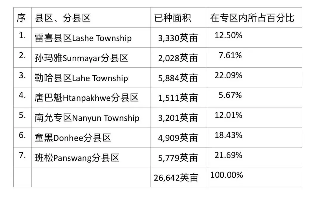 那加民族自治区内各县区种植的雨季稻种植面积如下表: