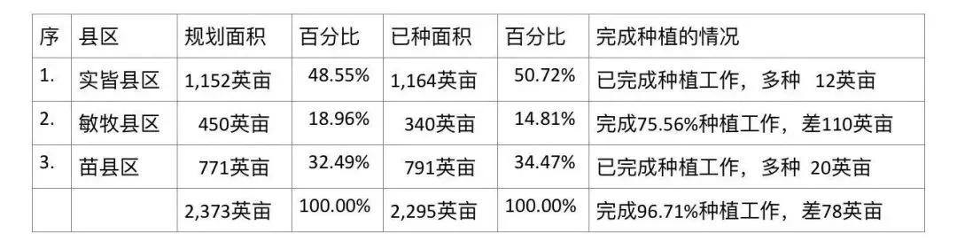 3个县区中,以实皆县区种植面积为最多,占全专区辣椒目前完成种植面的½以上的比例,种植面积第二多的是苗县区,种植面积占全专区种植面积的三分之一以上的比例。而且这2个县区目前完成的种植面积都已超过规划种植面积,只有敏牧县区目前还没有完成种植面积,还差110英亩。