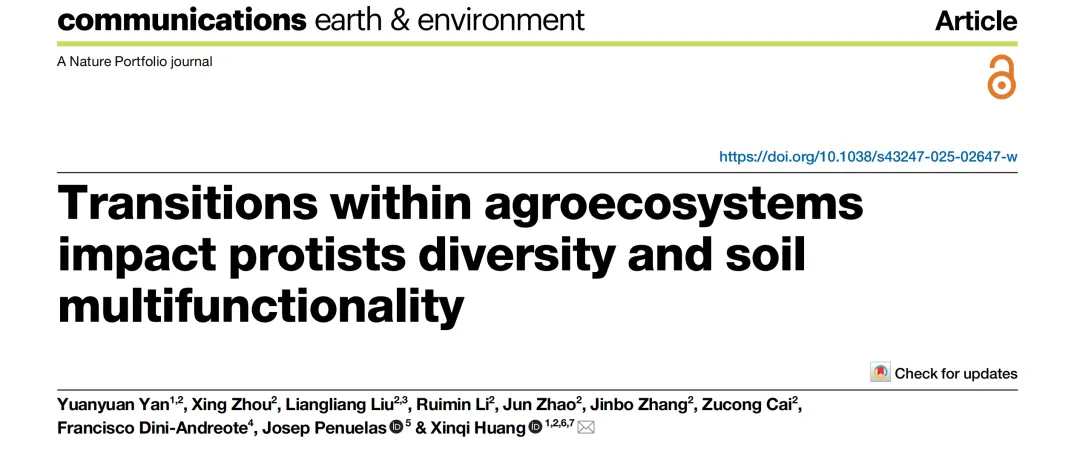 题目:Transitions within agroecosystems impact protists diversity and soil multifunctionality期刊:Communications Earth & Environment影响因子:7.29/ 9.5(2024/5年)
