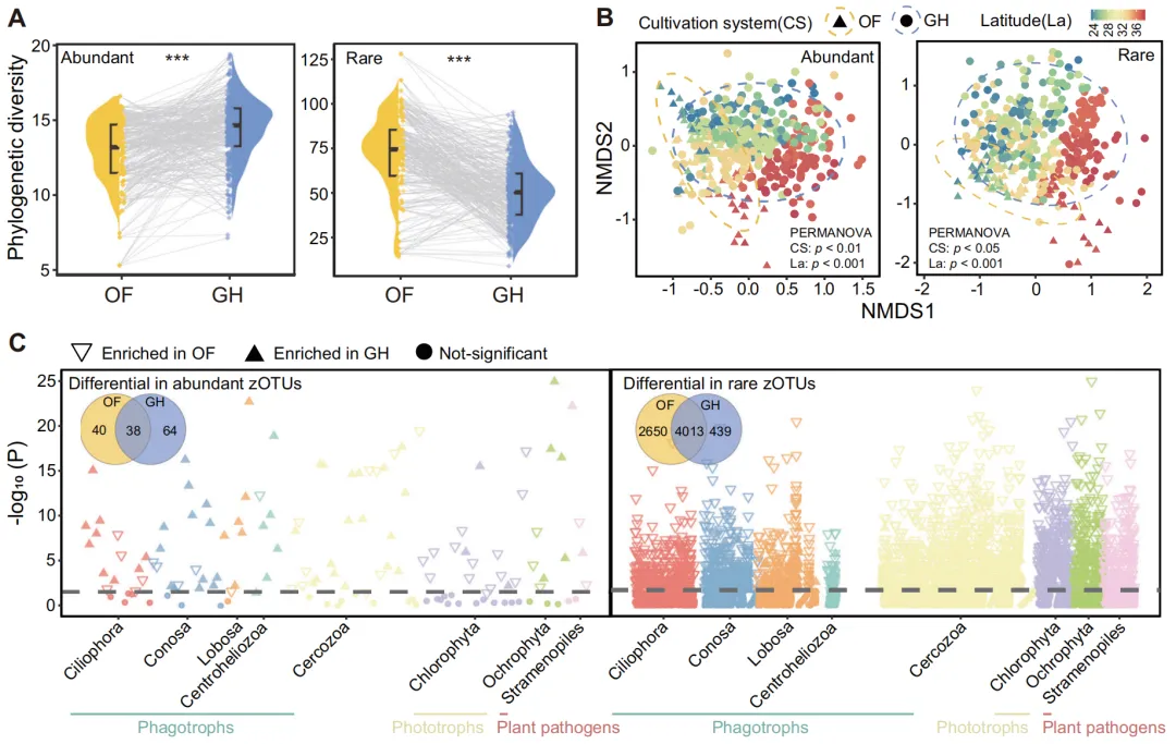 土壤原生生物是生态系统功能的关键贡献者。相较于森林、草地和农田等不同生态系统之间的转变,农业系统内部的转变对土壤微生物群落和功能的影响受到的关注较少。本研究调查了从露天(OF)栽培转变为温室(GH)栽培对多个配对地点土壤原生生物群落和多功能性的影响。结果表明,GH较OF降低了原生生物的系统发育多样性,对稀有原生生物的影响更大(稀有原生生物丰度降低了42.1%)。纬度是跨区域配对的OF和GH土壤中吞噬型原生生物群落变异的最强预测因子。土壤多功能性指数平均下降了17.7%,主要归因于GH土壤中稀有原生生物的丧失。重构实验证实,将来自OF土壤中的原生生物稀有类群接种到GH土壤中,能显著恢复GH土壤多功能性。本研究强调了低丰度原生生物在调节土壤功能中的关键作用。图1 土壤原生生物的多样性与群落组成。A.露天田间(OF)和温室(GH)系统下原生生物优势类群与稀有类群的系统发育多样性差异。星号表示露天田间与温室土壤间存在显著差异(Wilcoxon秩和检验,***p<0.001)。B.基于Bray-Curtis距离的非度量多维尺度分析(NMDS),展示露天田间和温室土壤中原生生物优势类群与稀有类群的群落结构差异,及其与种植系统(CS)、纬度(La)的关联。P值通过置换多元方差分析(PERMANOVA)确定。C.曼哈顿图展示在露天田间或温室土壤中显著富集的零半径操作分类单元(Wilcoxon秩和检验,p<0.05)。每个圆点或三角形代表一个独立的零半径操作分类单元,不同颜色的零半径操作分类单元代表原生生物的不同门,内嵌维恩图显示在开放田间或温室土壤中显著富集的零半径操作分类单元数量。2. 原生生物群落的生态位宽度