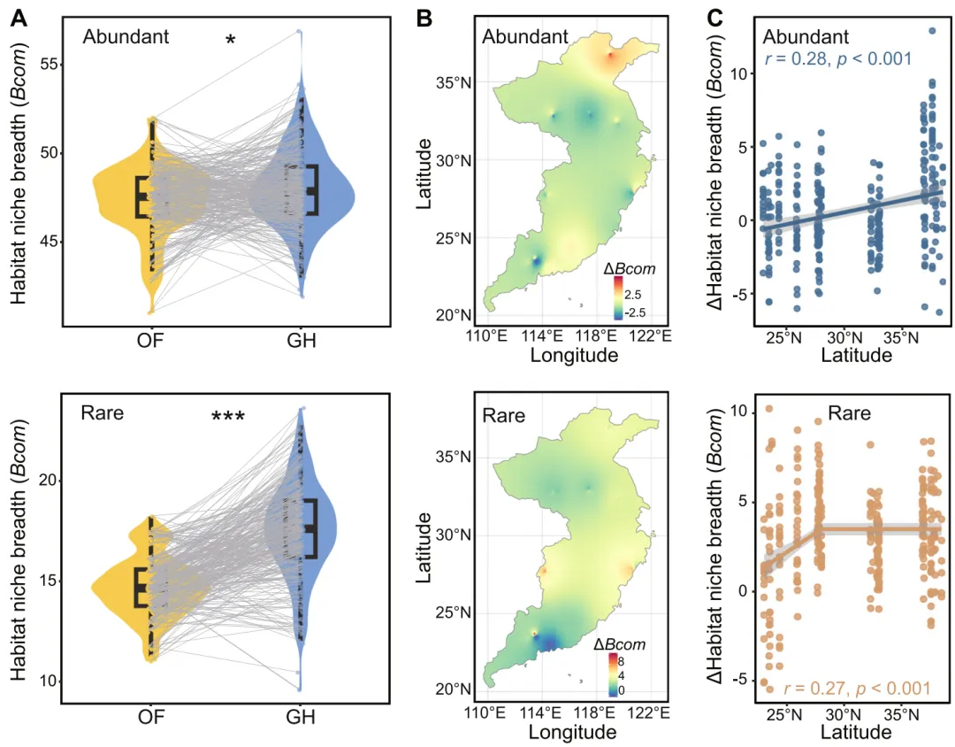 图2 原生生物群落的平均生境生态位宽度(Bcom)。A.开放田间(OF)与温室(GH)土壤中原生生物优势群落和稀有种群落的平均Bcom对比图。灰色线条连接每组配对的露天田间与温室土壤。星号表示露天田间与温室土壤间存在显著差异(Wilcoxon秩和检验,*p<0.05;***p<0.001)。B.配对露天田间与温室土壤间原生生物优势群落和稀有种群落的ΔBcom空间分布预测图。该图采用反距离权重插值法绘制。C.原生生物群落的ΔBcom与纬度的相关性。回归线周围的阴影误差带代表95%置信区间。ΔBcom由每组配对温室土壤与露天田间土壤的Bcom差值计算得出。