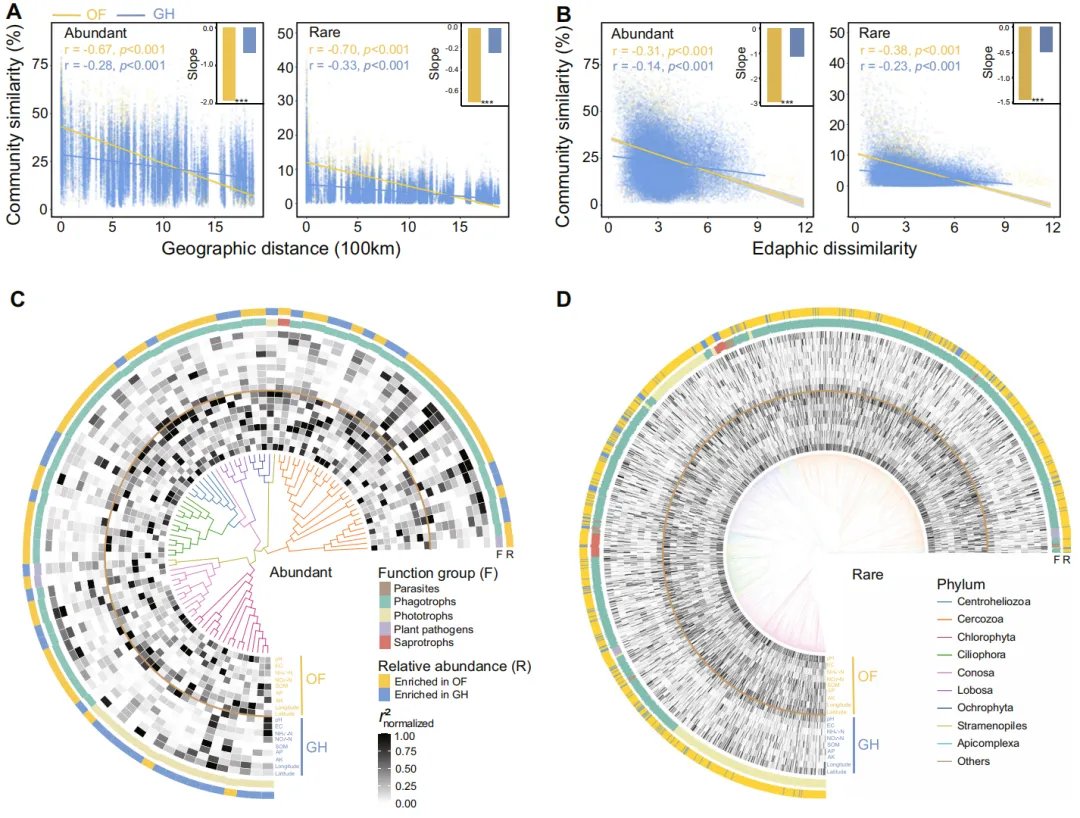 图3 原生生物群落与环境因子的关系。A.原生生物群落相似性与地理距离的距离衰减关系。B.原生生物群落相似性与土壤环境异质性的关系。黄色和蓝色实线分别代表露天田间(OF)和温室(GH)土壤的线性最小二乘回归。星号表示露天田间与温室土壤的回归斜率存在显著差异(***p<0.001)。C、D 为在露天田间或温室土壤中显著富集的优势、稀有零半径操作分类单元及其与环境因子的关系。系统发育树中仅纳入露天田间与温室系统间存在统计学差异的零半径操作分类单元(校正后p<0.05)。内环热图分别展示露天田间和温室土壤中零半径操作分类单元的相对丰度与环境因子的相关性。