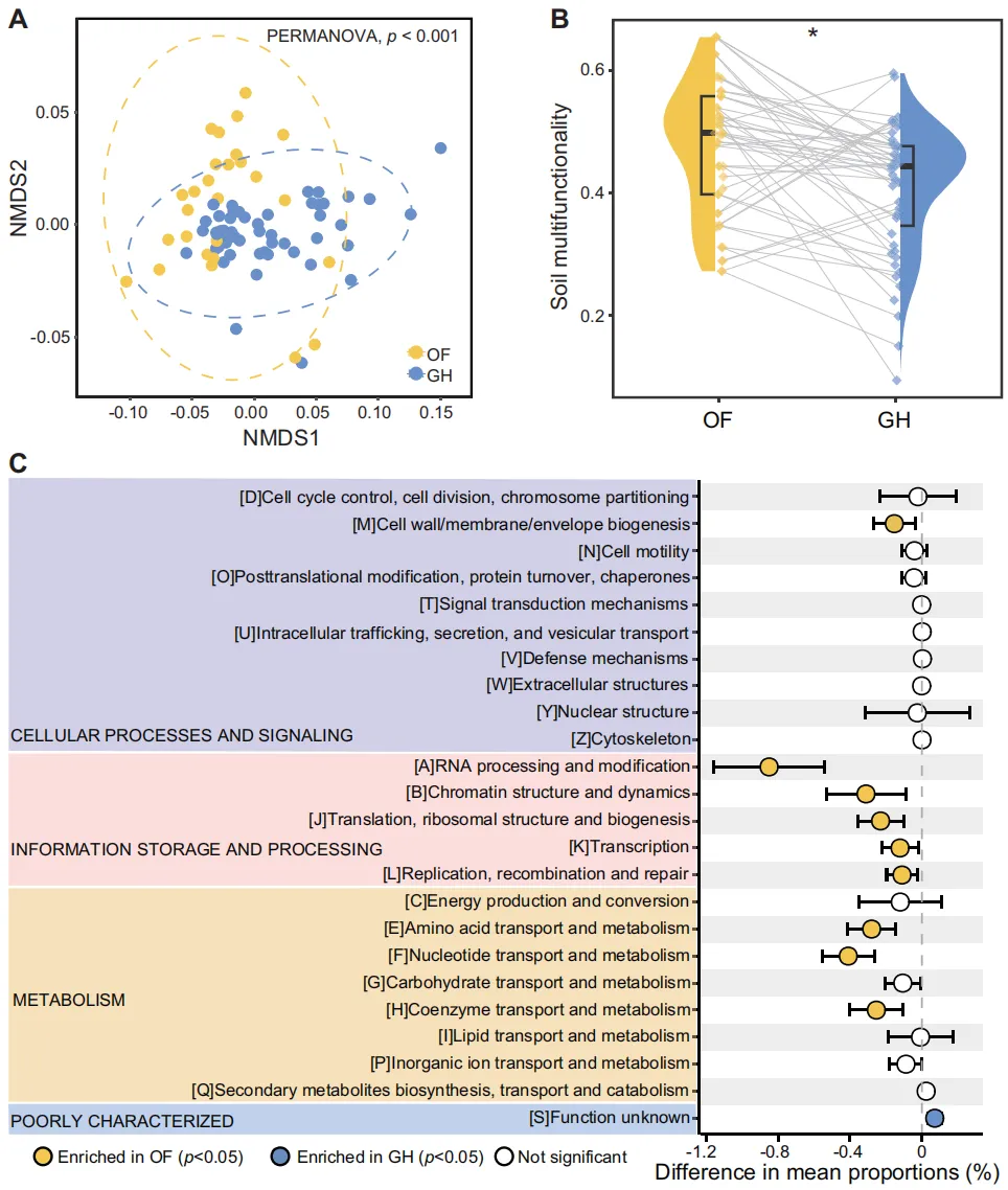 图5 开放田间(OF)与温室(GH)系统下微生物功能的差异。A.基于Bray-Curits距离,对经eggNOG数据库注释的土壤微生物功能进行的非度量多维尺度分析(NMDS),P值通过置换多元方差分析(PERMANOVA)确定。B.露天田间与温室土壤间土壤多功能性指数的差异(Wilcoxon秩和检验,*p<0.05)。C.露天田间与温室土壤间功能基因丰度的差异。
