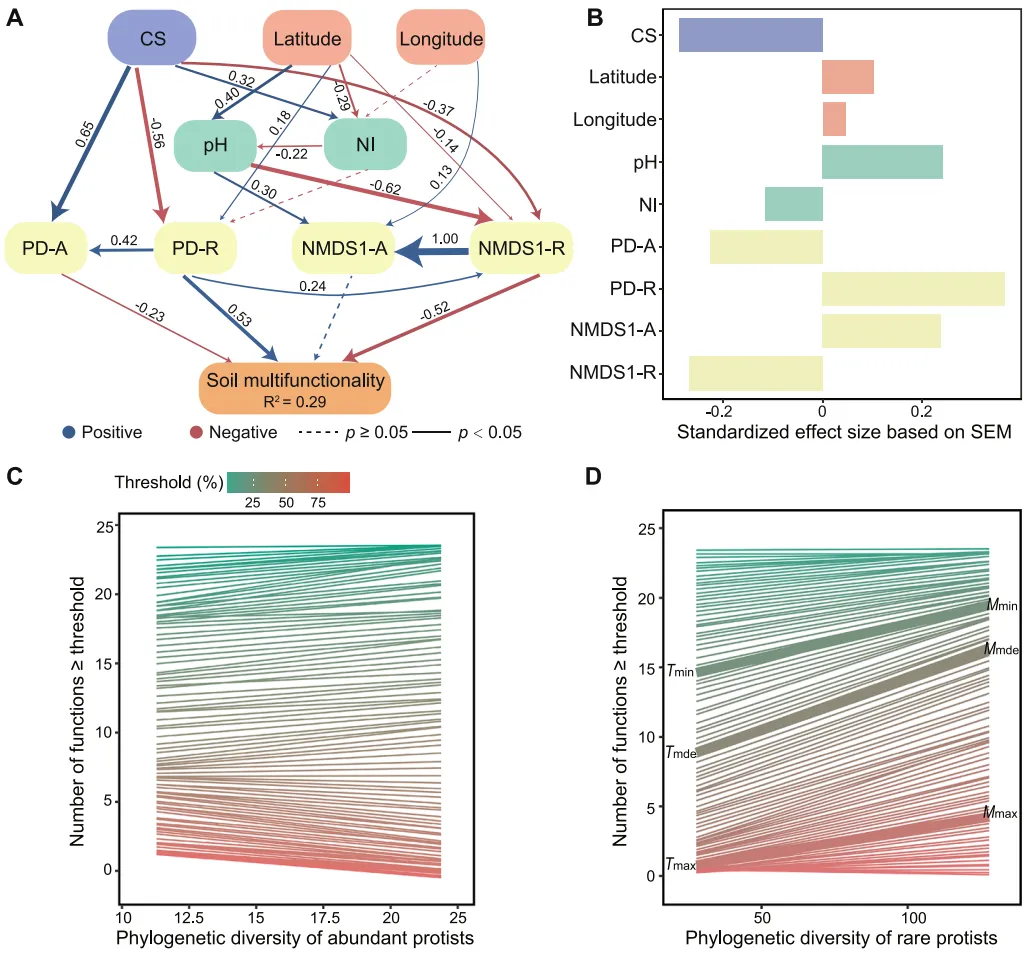 图6 土壤多功能性变异的影响因素。A。结构方程模型(SEM)展示多种因素对土壤多功能性的影响,路径宽度代表路径系数的大小。模型参数为:卡方值=29.61,自由度=21,p=0.100,比较拟合指数=0.975,均方根误差=0.073。CS为种植系统,NI为土壤养分有效性指数,PD-A和PD-R分别为优势类群和稀有类群的系统发育多样性,NMDS1-A和NMDS1-R分别为优势和稀有零半径操作分类单元非度量多维尺度分析(NMDS)的第一轴得分。B.结构方程模型中各变量的标准化总效应。C、D 分别为优势(C)和稀有(D)原生生物类群的系统发育多样性与土壤多功能性的关系(基于多阈值法,即土壤功能数超过一系列连续阈值,阈值范围1%至99%,间隔1%)。Tmin和Tmax分别为斜率与零存在显著差异的最低和最高阈值,Tmde为斜率最大的阈值。