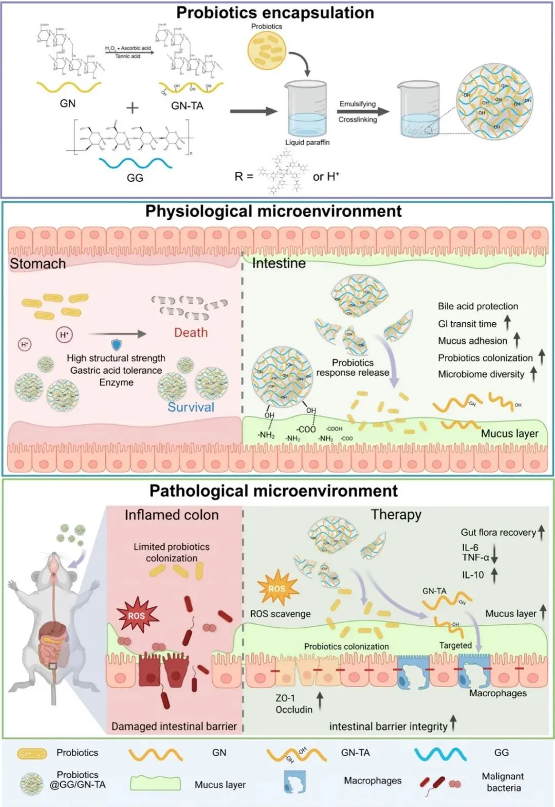 2. pH响应性结构自适应与多重保护机制。①结构自适应保护:在胃酸环境(低pH)下,微球中的羧基发生质子化,诱导网络结构收缩致密,有效阻滞了H+的渗透,从而为益生菌提供了“盾牌”式保护。在模拟胃液消化及长期储存条件下,负载于GG/GN-TA微球中的双歧杆菌(Bifidobacterium animalis)与大肠杆菌Nissle 1917(EcN)存活率显著高于游离菌及纯GG微球组。②肠道靶向与黏附:当微球进入肠道(中性pH)后,羧基解离导致网络溶胀,孔径增大,促进益生菌释放。同时,GN-TA组分中的单宁酸提供了丰富的邻苯二酚基团,赋予微球优异的黏膜黏附性;而β-葡聚糖则能特异性识别巨噬细胞表面的Dectin-1受体,实现了对炎症部位的主动靶向。