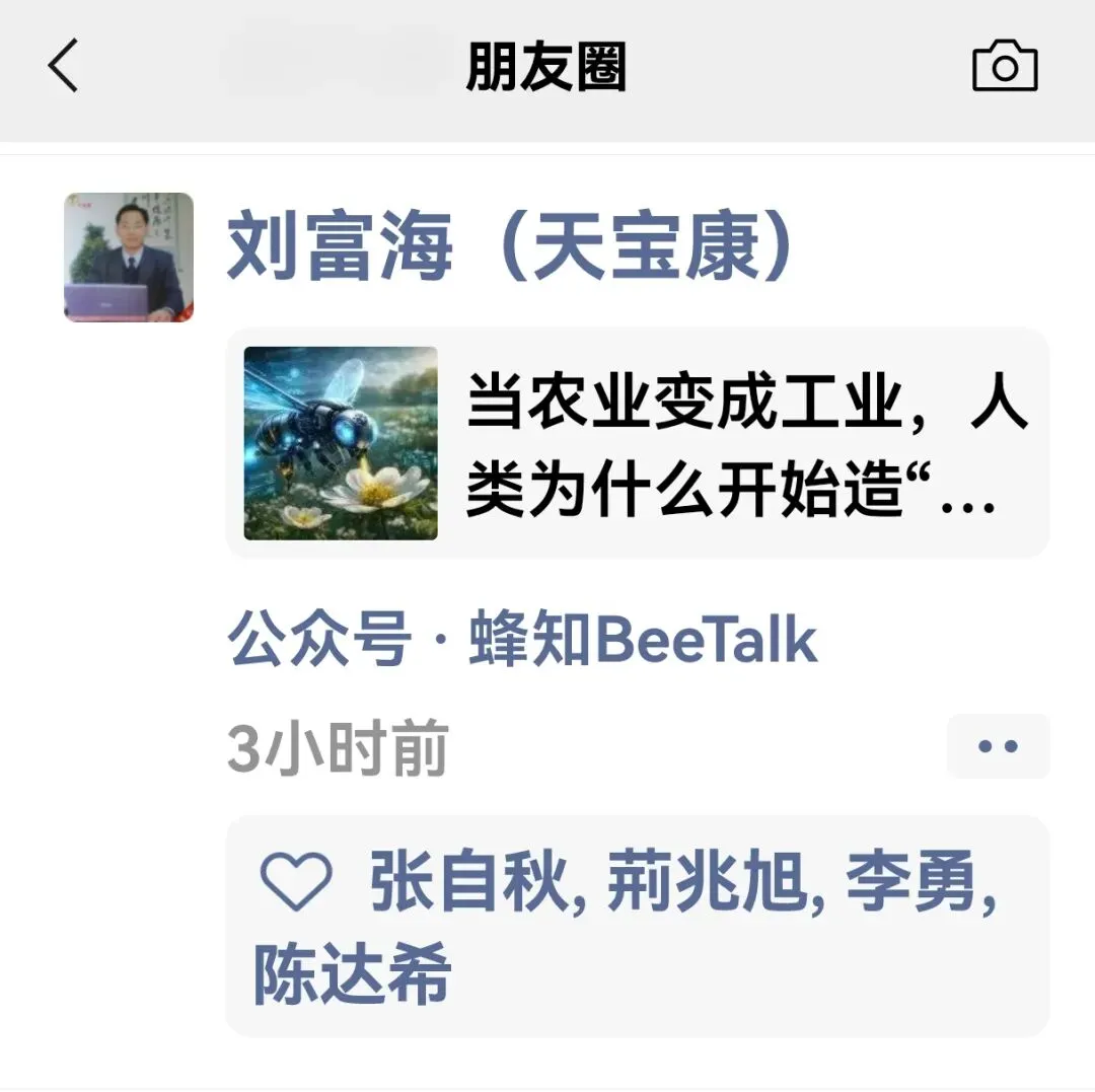 “宋心仿蜂业发展基金会”理事兼专家委员会委员、北京天宝康高新技术开发有限公司董事长刘富海的微信朋友圈里发布了以下信息: