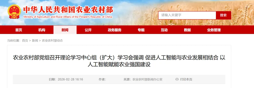 2026年2月27日,中华人民共和国农业农村部召开党组理论学习中心组(扩大)学习会。会议明确将“人工智能+”作为落实党的二十届四中全会精神的核心抓手,确立了以人工智能赋能农业强国建设的战略路径。部党组书记、部长韩俊主持会议并部署四项核心任务:夯实数字底座、突破关键技术、拓展应用场景、构建产业生态。此次会议标志着中国农业信息化政策从“数字化”向“智能化”的范式转移,为政企信息化服务商提供了明确的市场准入信号与技术攻关方向。