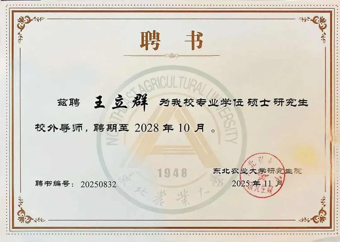 近日,王立群律师正式受聘担任东北农业大学专业学位硕士研究生校外导师,聘期至2028年10月。