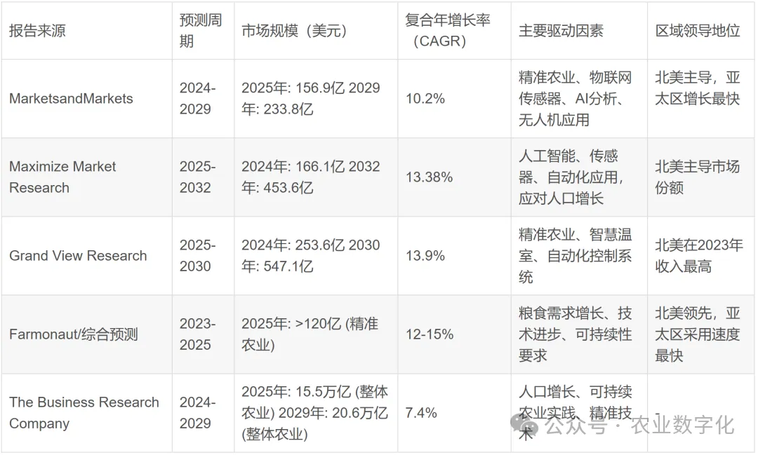 多家权威机构的预测揭示了市场的强劲增长势头。MarketsandMarkets预测,全球市场规模将从2024年的144亿美元增长至2025年的156.9亿美元,并有望在2029年达到233.8亿美元,预测期内(2024-2029)的复合年增长率(CAGR)为10.2% 。Maximize Market Research的评估则更为乐观,其数据显示2024年市场价值为166.1亿美元,预计到2032年将达到453.6亿美元,复合年增长率高达13.38% 。Grand View Research的估算值更高,认为2024年市场规模已达253.6亿美元,并将在2030年增至547.1亿美元,复合年增长率为13.9% 。此外,亦有研究预测2025年全球市场规模将接近700亿美元,这一数字可能涵盖了更广泛的产业范围,如受数字化影响的全部农业产值 。