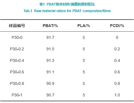 原料:固定PBAT与PLA的配比,通过改变PCDI的添加量(0%, 0.2%, 0.4%, 0.6%, 0.8%, 1.0%)制备了六种复合材料(编号P30-0至P30-1),并吹塑成薄膜。