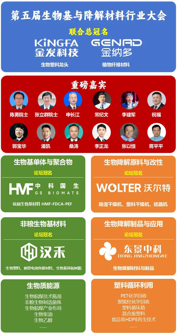 分论坛冠名:中科国生(呋喃生物基材料)、沃尔特(塑料干燥机)、汉禾(生物塑料、新型电池负极材料、生物基环氧树脂)、东景中科(生物降解材料与制品)