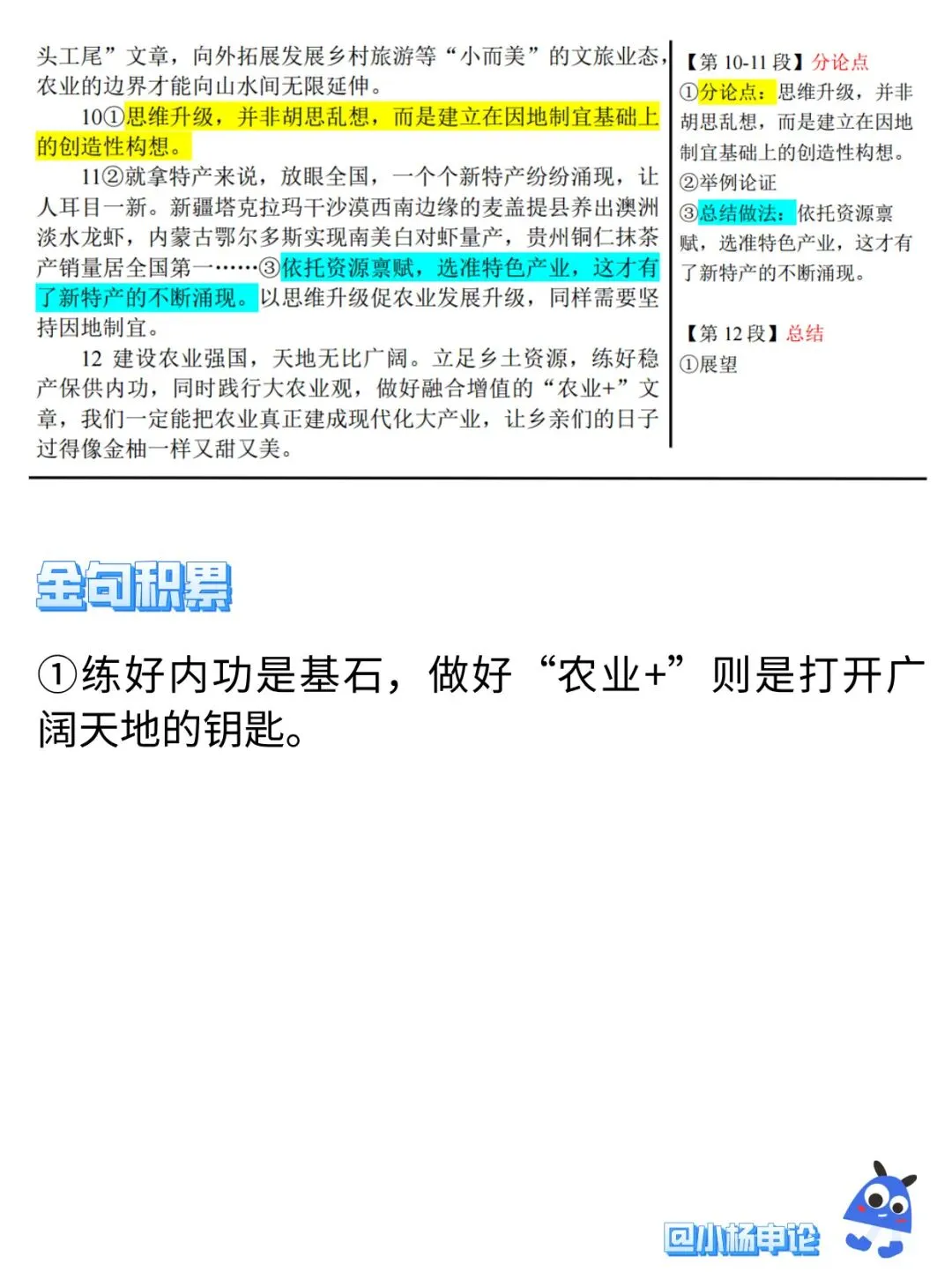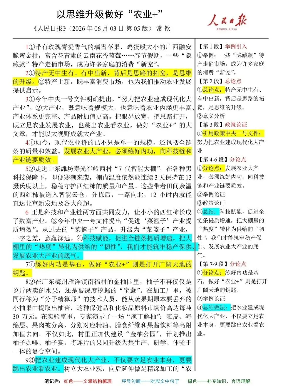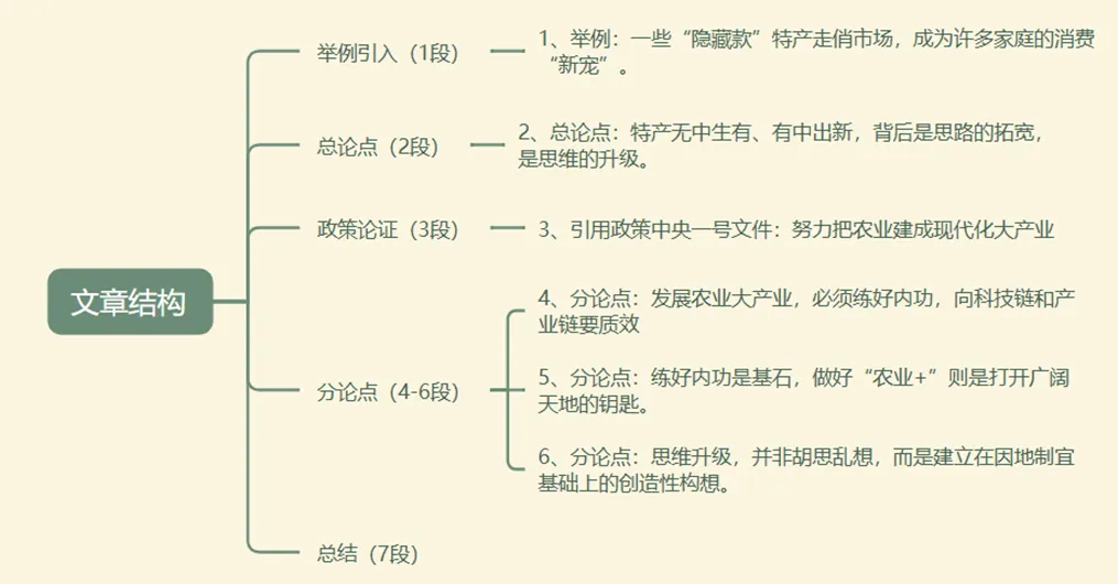 来看文章,开篇以春节走俏的“隐藏款”特产为引,点出“特产无中生有、有中出新”背后的思维升级主题。随后,引入2025年中央一号文件关于“把农业建成现代化大产业”的部署,确立全文论述的战略定位。文章主体部分分三部分展开论述:一是“练好内功”,以山东寿光“7代智能大棚”和冷链物流为例,说明科技赋能和产业链整合如何提升农业的稳产保供能力和质量效益;二是“做好农业+”,以广东梅州金柚从疏果到加工、从果园到文旅的全方位开发为例,展示跳出农业看农业、推动一二三产融合的无限可能。三是“思维升级”必须建立在“因地制宜”基础上,并以新疆龙虾、内蒙对虾、贵州抹茶等新特产案例佐证。最后,落脚于建设农业强国的宏大愿景,提出练好内功、做好“农业+”的实践路径,并以“乡亲们日子过得像金柚一样甜”作结,既有高度又有温度。这里也提示大家,农业大产业的本质是让农民从产业链的末端走向前端,从价值分配的被动接受者变为主动创造者和共享者。对于考生而言,理解这一点,就能在回答相关问题时,始终紧扣“以人民为中心”的发展思想,让对策建议不仅有产业高度,更有民生温度。
