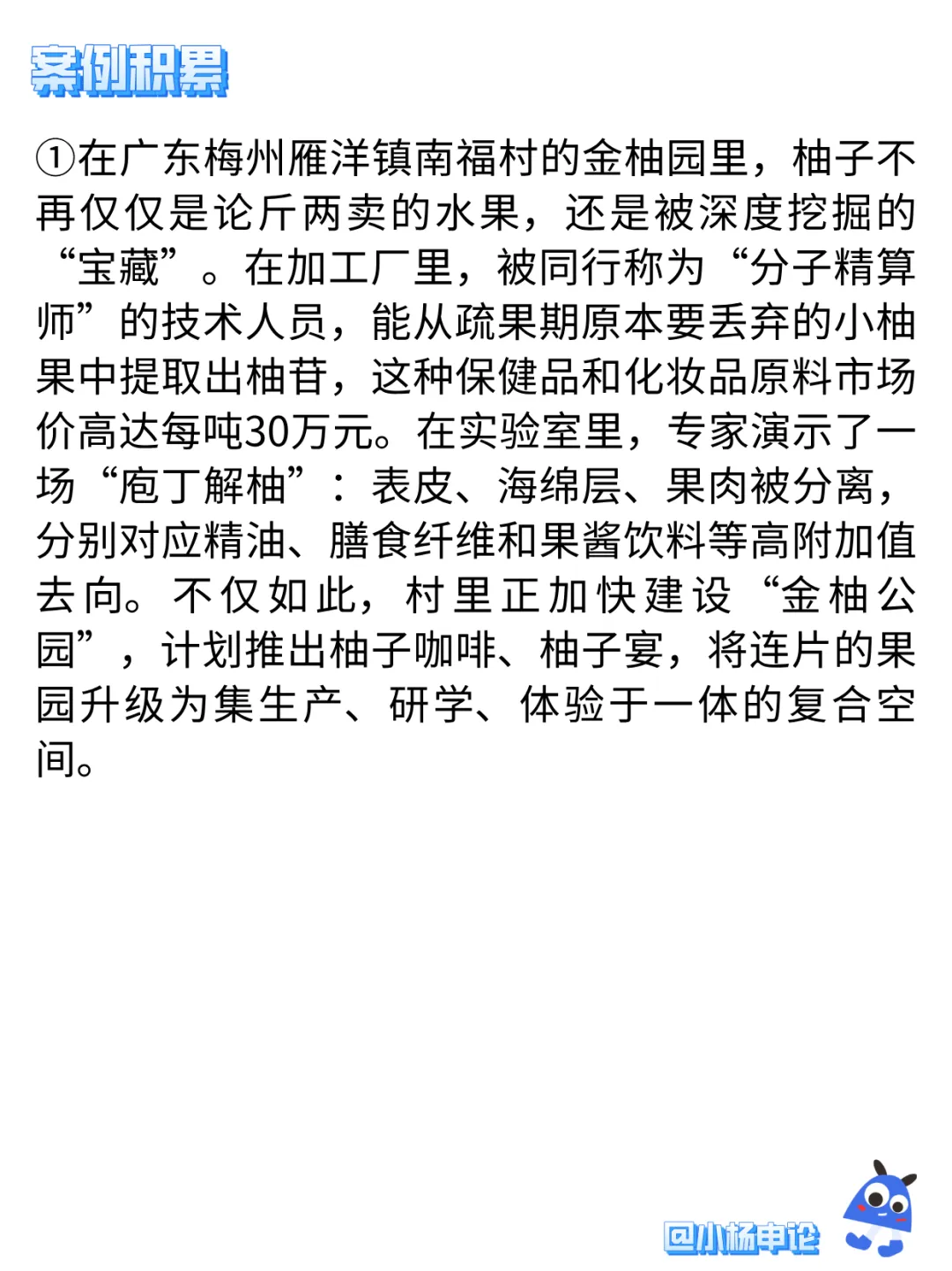 最后仿写部分,庖丁解柚这一表述极富创意和画面感。“庖丁解牛”是中国古代寓言中的经典典故,形容技艺精湛、游刃有余。将其化用为“庖丁解柚”,形象地描绘了梅州金柚被精细加工、物尽其用的全过程——表皮、海绵层、果肉被分离,分别转化为精油、膳食纤维、果酱饮料等高附加值产品,甚至疏果期的小柚果也能提取出价值高昂的柚苷。我们可以借鉴这种 “化用经典”的表达方式,在论述中借用广为人知的典故或成语,赋予其新的时代内涵。例如,在论述人才工作时,可以仿写【各地在引才工作中要有“萧何月下追韩信”的诚意,更要有“三顾茅庐”的耐心,让天下英才近悦远来。】在论述基层治理时,可以写【化解邻里纠纷需要“六尺巷”的礼让精神,更需要新时代的“枫桥经验”和法治思维。】在论述生态保护时,可以写【守护绿水青山,既要有“愚公移山”的韧劲,也要有“大禹治水”的智慧,疏堵结合、久久为功。】这种表达能让论述更具文化底蕴和说服力。
