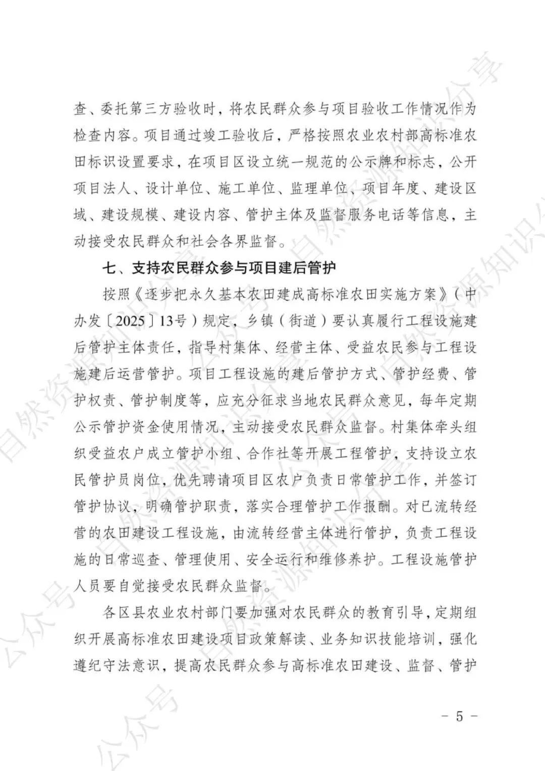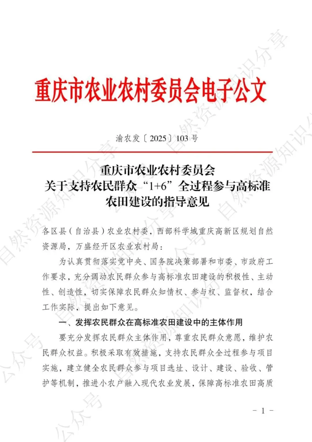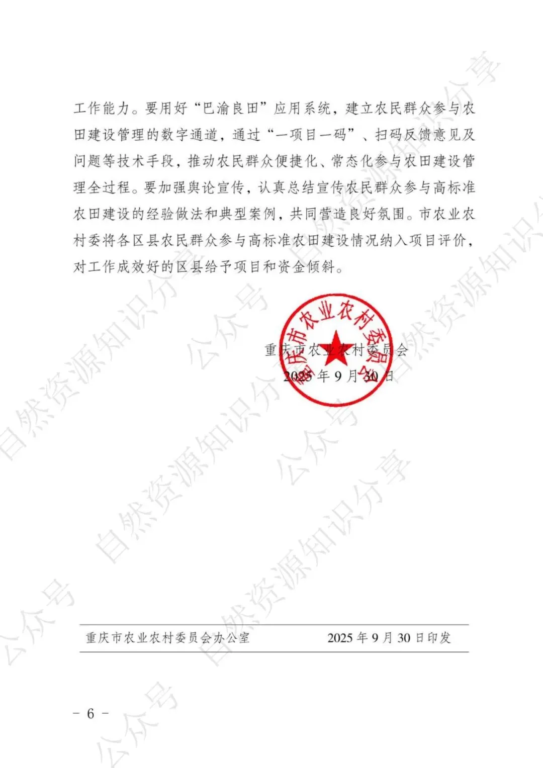 >【政策速递】重庆市农业农村委员会关于支持农民群众“1+6”全过程参与高标准农田建设的意见(渝农发〔2025〕103号)